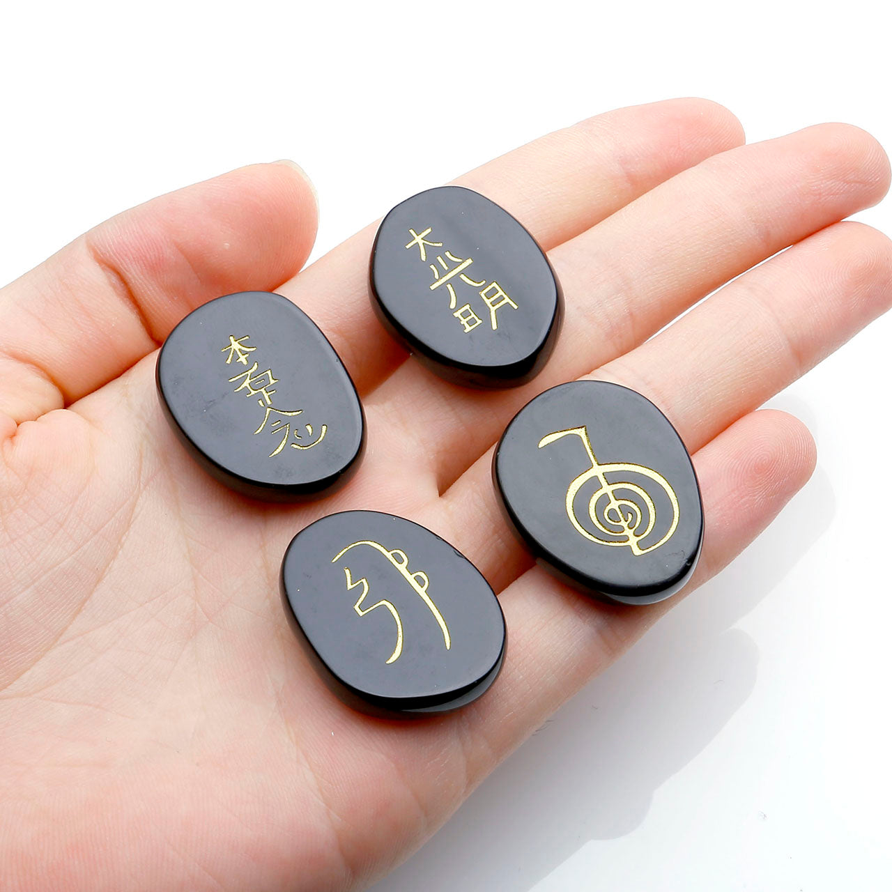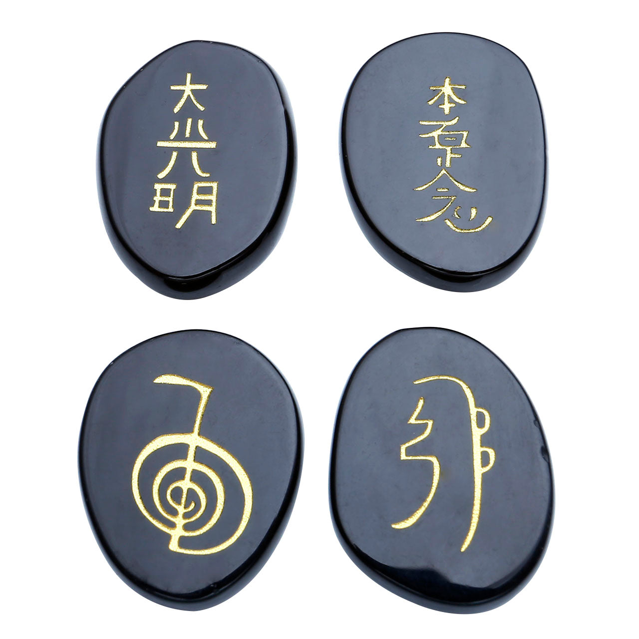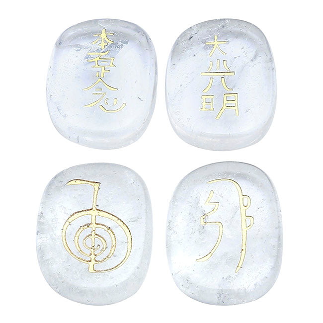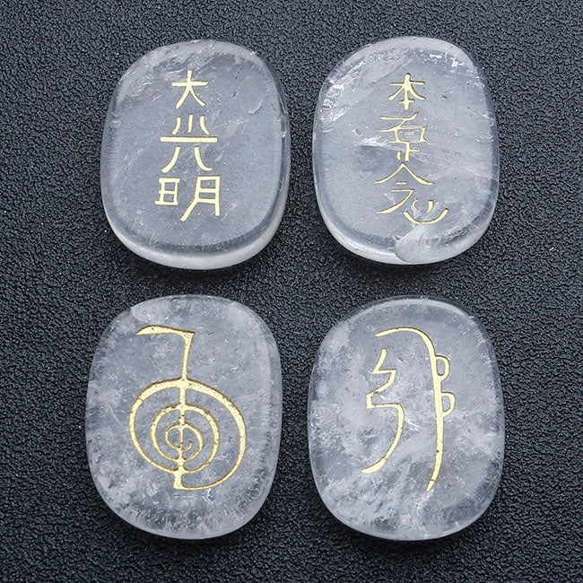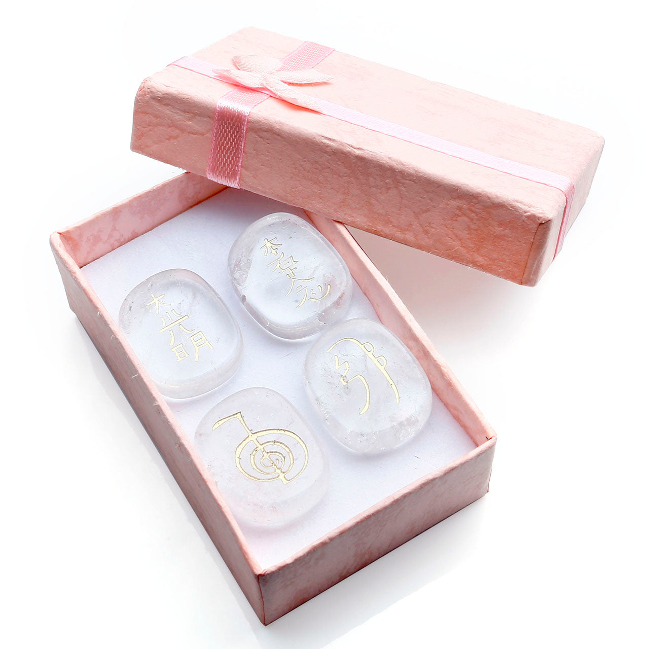 - Reiki Chakra Stones Rose Quartz Crystals For Healing. Set of 4 chakra meditation stones w/ engraved Usui Reiki symbols for easy reference during holistic treatment. The Set Includes a Pouch,Make it a prefect gifts. Easy to travel with. And Carry as an amulet in your pocket, purse or pouch.