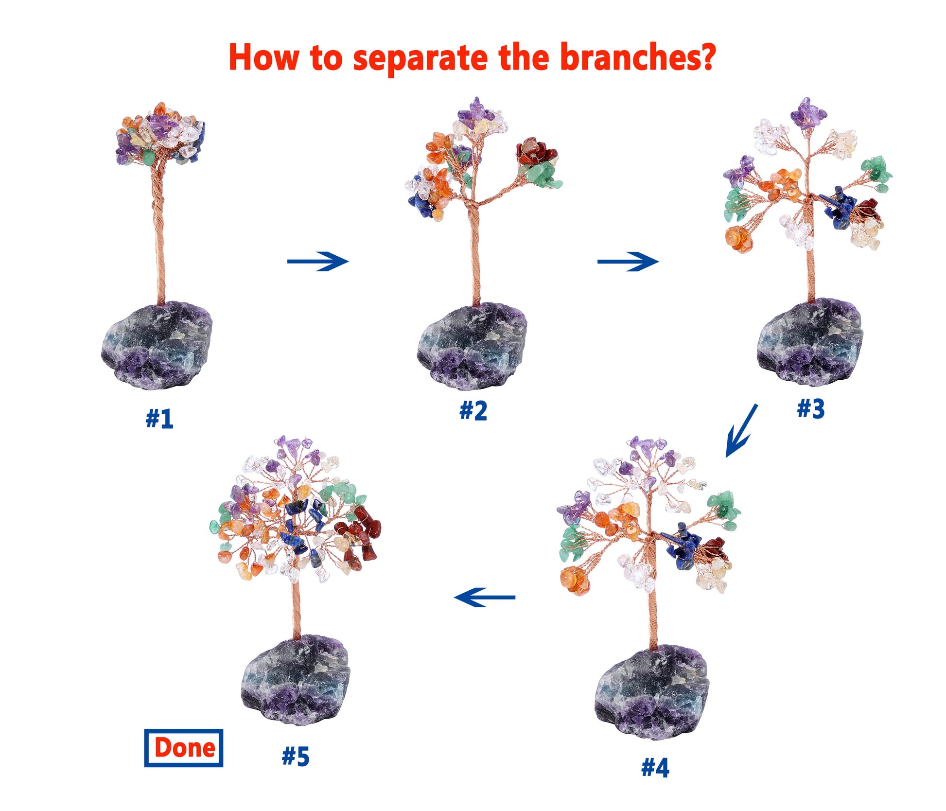 The crystal gem stones of the tree will be fold up all branches and pack secured. Leaves and branches can be arranged how you like. You can just twist the crystal out and your crystal gem stones money tree will be flourishing again. You need to arrange the branch and leaves with patience. It will looks more Beautiful.