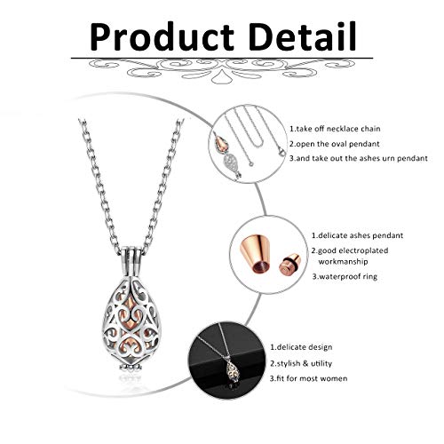 - SIZE DETAIL – Hollow Teardrop Pendant measure approximately 1.1" tall, and 0.5" width. Inside Jar Diameter:0.51"x0.35"; deepth:7mm(0.24"); Chain measures 22" long and 2mm think a perfect sized cremation urn necklace. Pls note: Only Daily waterproof. pls take off your jewelry when Diving or swimming.