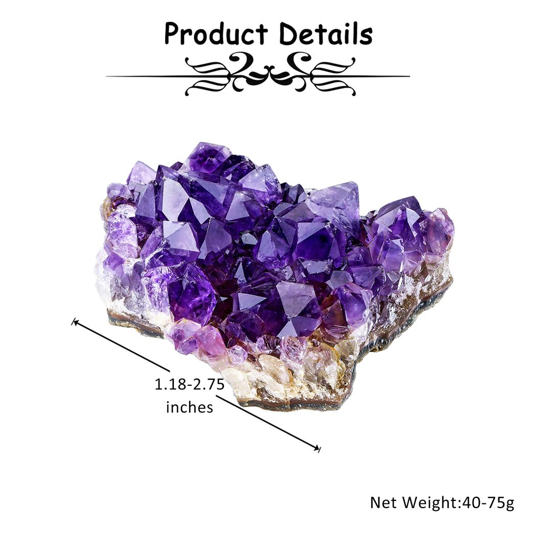 Amethyst Cluster Size is approximately 1.57"-3.15"(40-80mm)(Small Size). Weight is approximately 0.18-0.33Ib(80-150g). Quantity:1PC. Since the crystals are natural, the crack or chips will be normal, the sizes and colors of them are different with each other, we will send what we have by random.