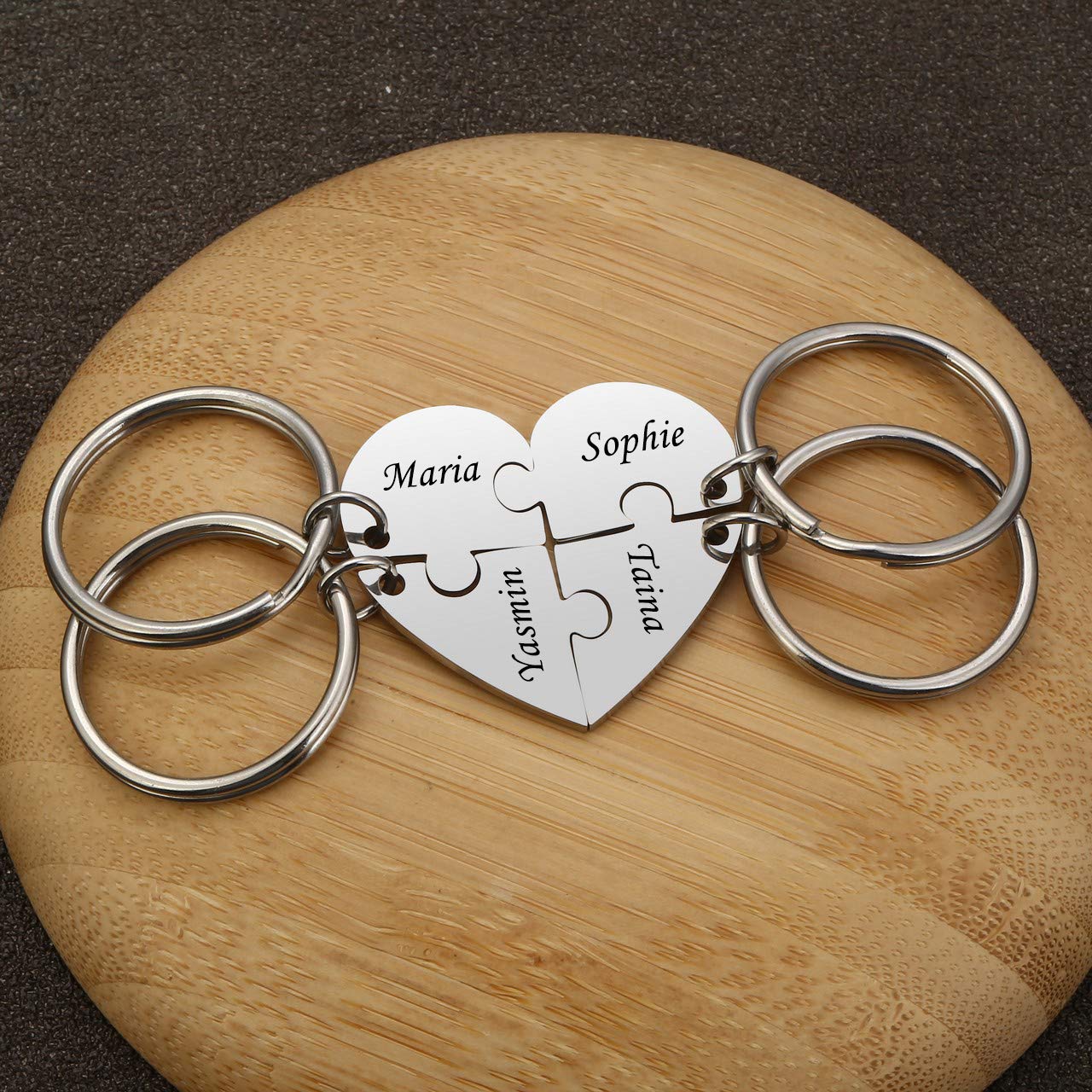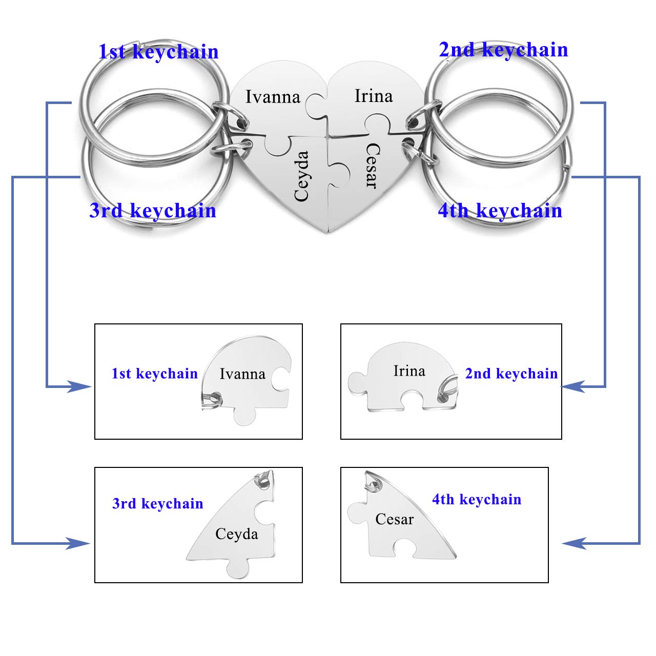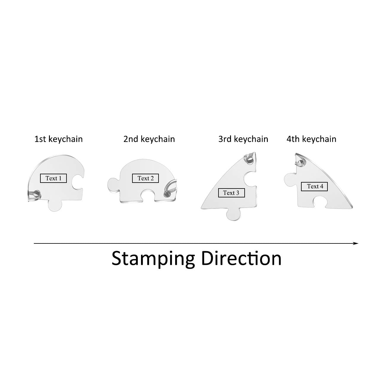 - ♥Personalized Best Friend Keychains: Each front side of puzzles can be engraved one line, text up 10 characters per puzzle. There are 4 Fonts in choices. Engraving suggestions:Names,Feelings,Dates,Coordinates,Numbers,Lines from songs,Dreams,Meaningful Words,etc.