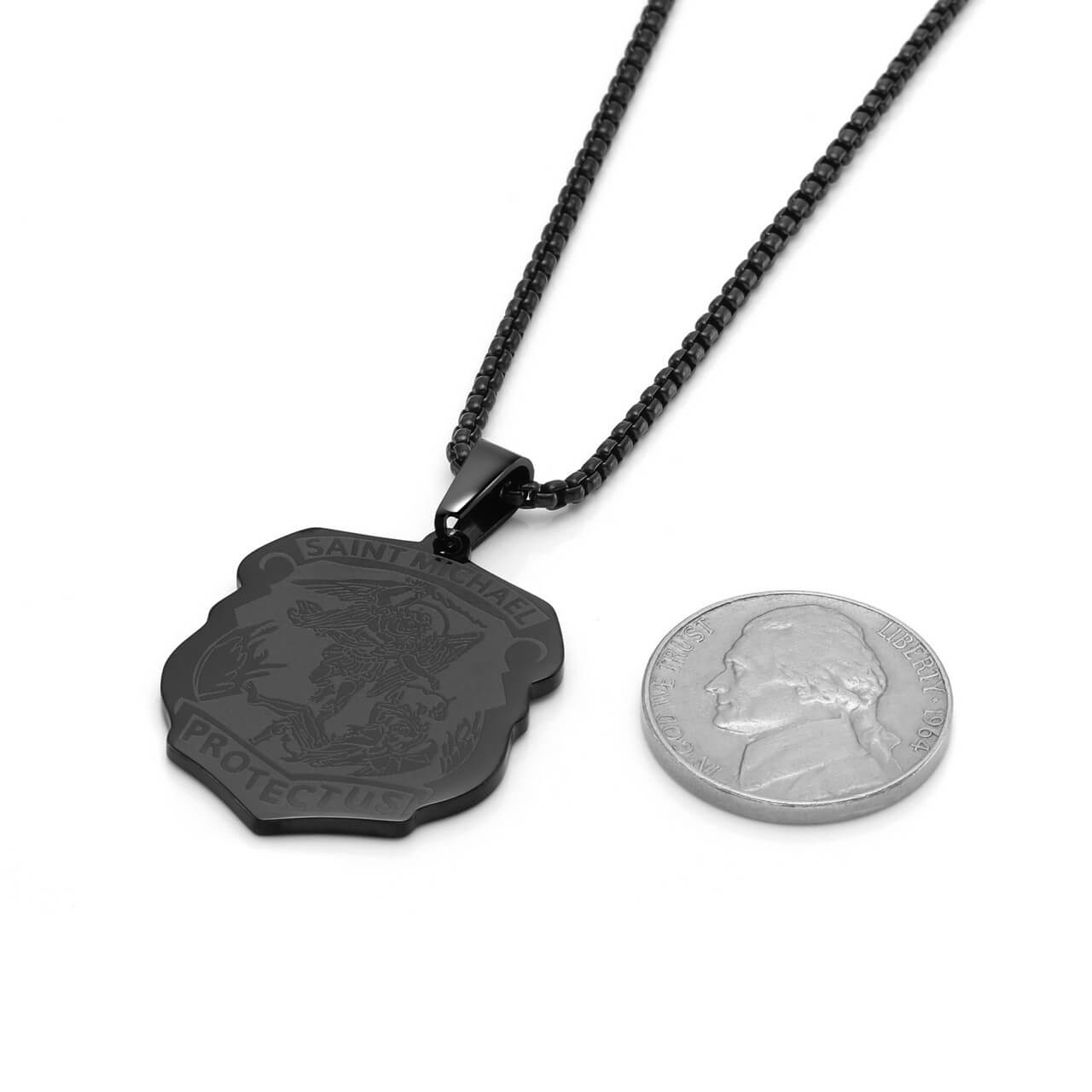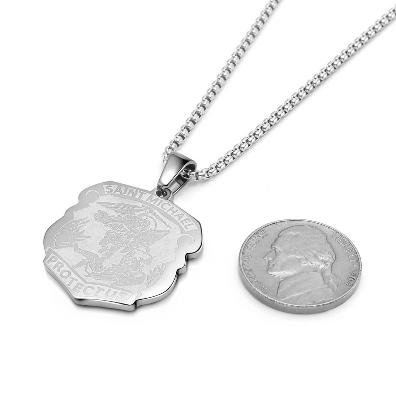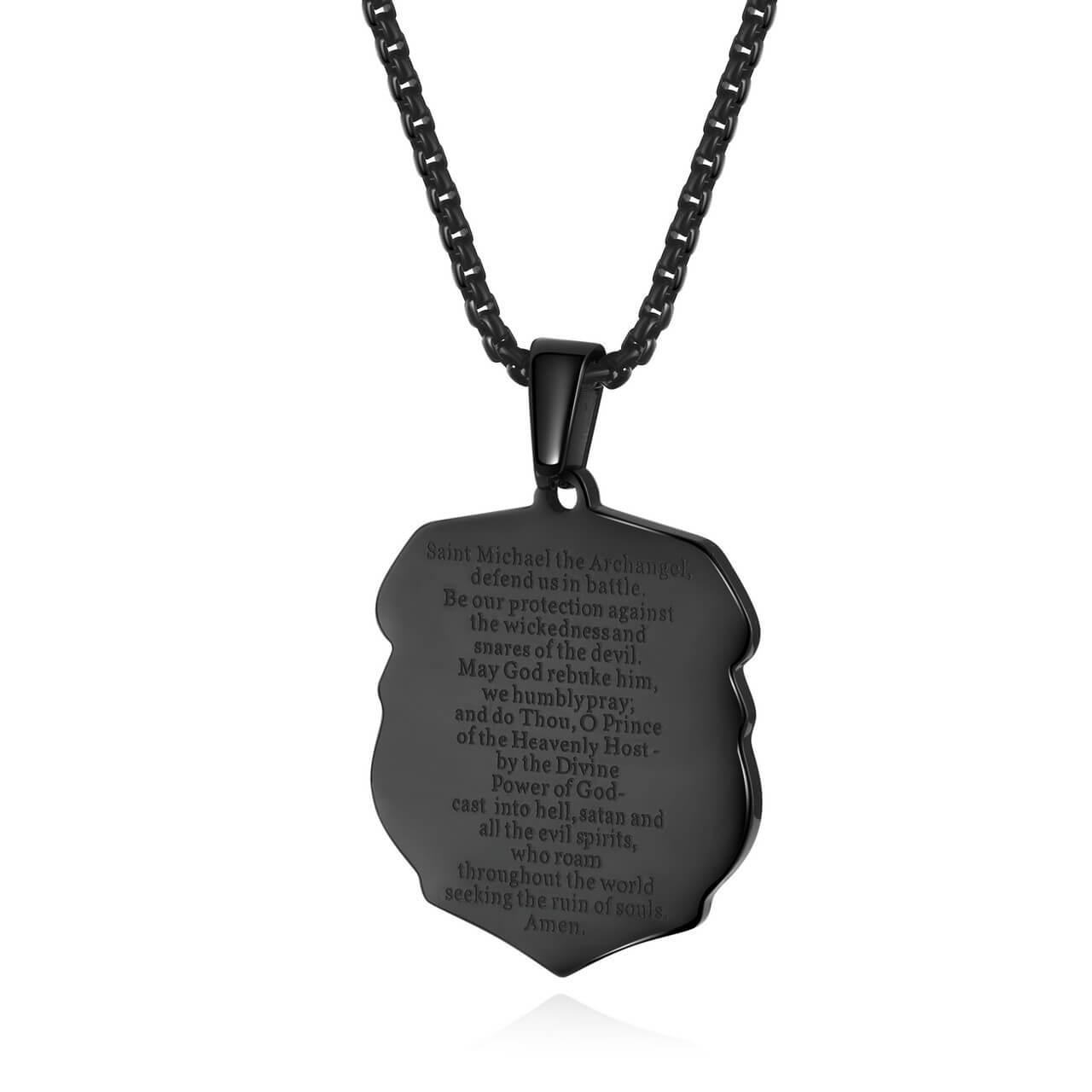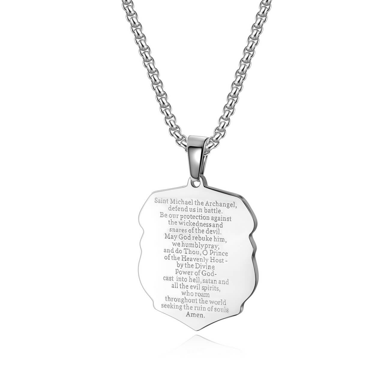 - Words on the pendant: Saint Michael the Archangel, defend us in battle, Be our protection against the wickedness and snares of the devil. May God rebuke him, we humbly pray and do Thou, O Prince of the Heavenly Host by the Divine Power of God cast into hell, satan, and all the evil spirits, who roam throughout the world seeking the ruin of souls. Amen.