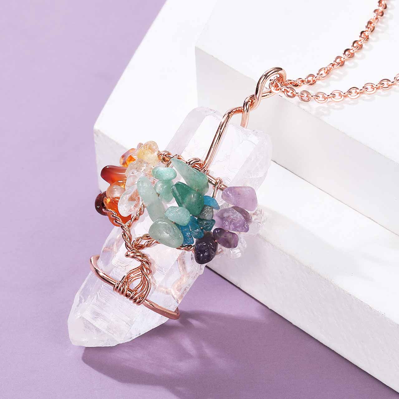 ❤️Unique Design Pendant--tumbled stone Tree of life entwined cut raw rock crystal quartz Column.7 Chakra Tumbled gemstones:Clear Crystal Quartz,Amethyst,Blue Apatite,Green Aventurine,Citrine,Red Agate,Red Jasper.